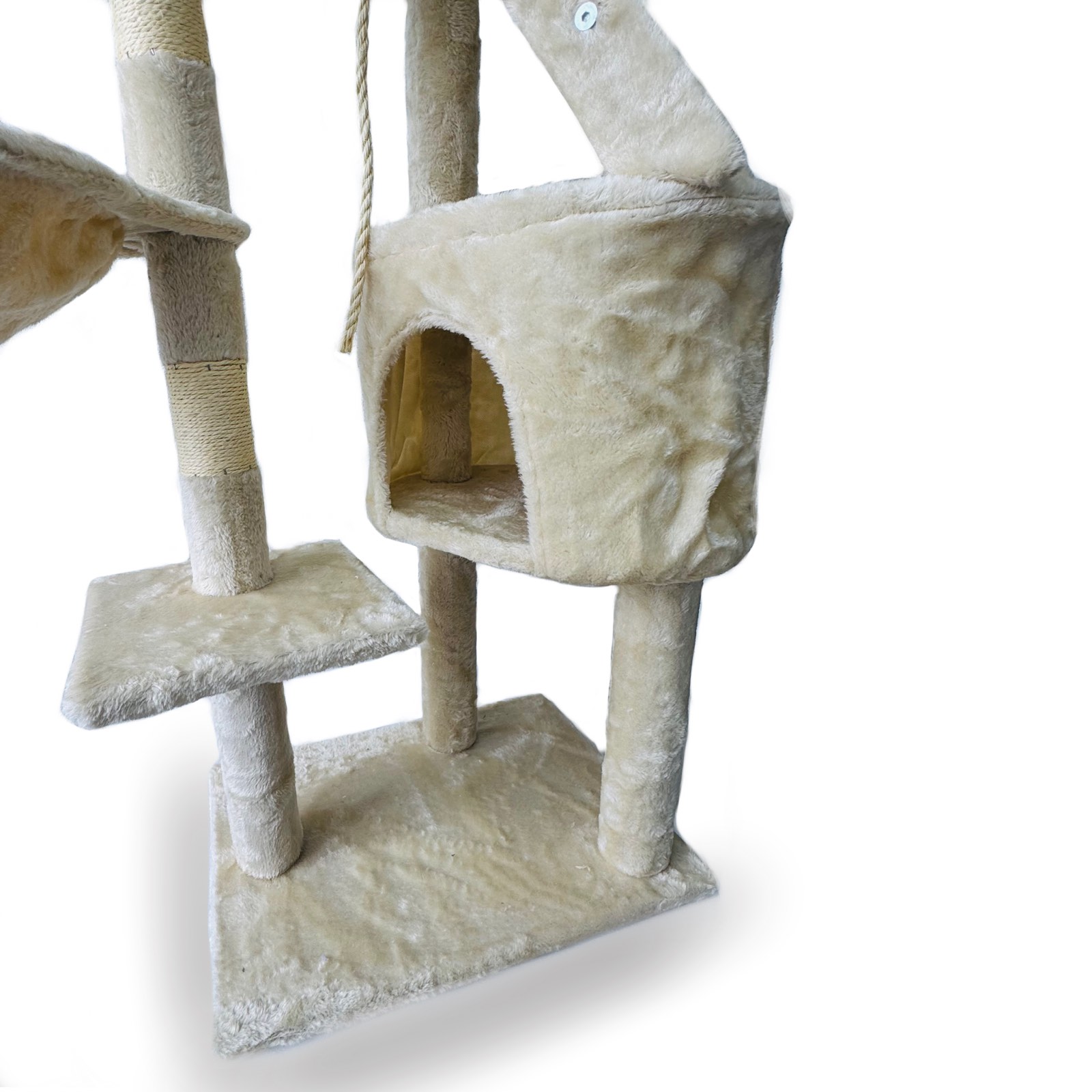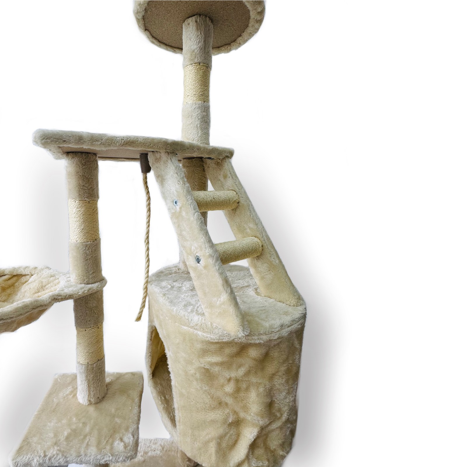 Котешко приключение на три етажа! Това дърво предлага всичко – уютна хралупа за скриване, хамак за сладки дрямки, стълба за катерене и въже за неустоими игри. Идеалното място, където вашето коте може да скача, почива и да се забавлява цял ден!